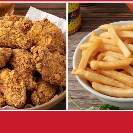350 gramas de frango empanado a escolha, 300 gramas de batata palito, 500 gramas de risoto de frango, 400 gramas de maionese de batata, refrigerante 2L a escolha