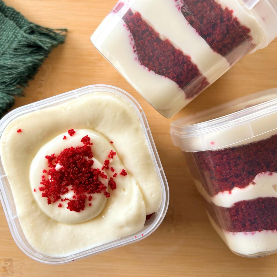 Bolo Red Velvet com recheio de cream cheese, brigadeiro branco e geléia artesanal de morango. Fantástico! Pote de 220ml.