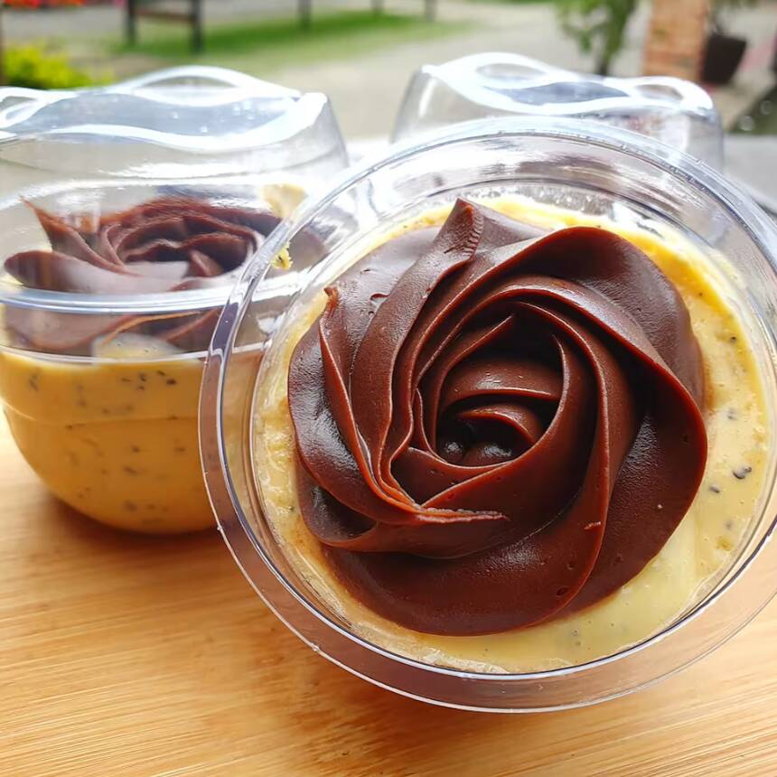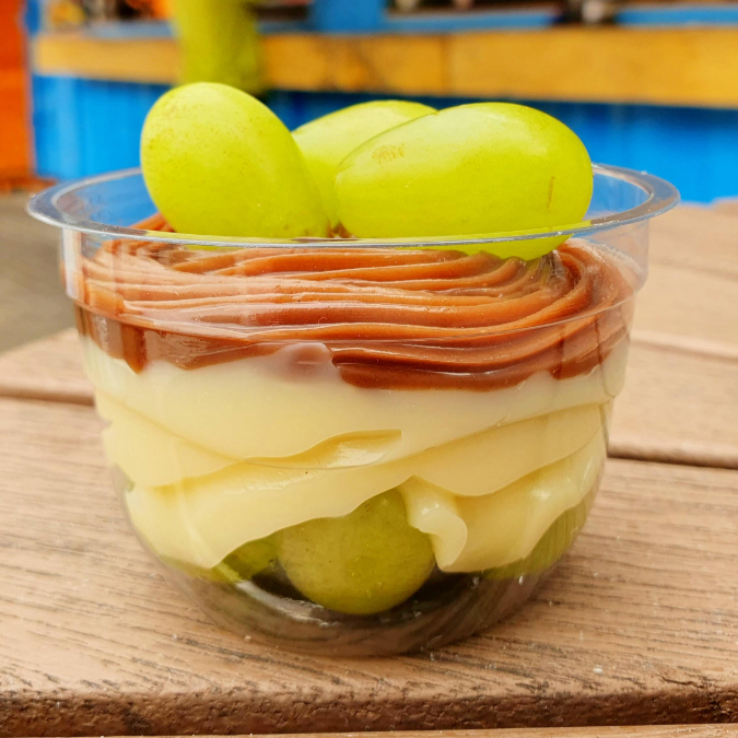 120ml de brigadeiro preto 50% cacau com brigadeiro branco bem cremosinho e uvas verdes sem semente!