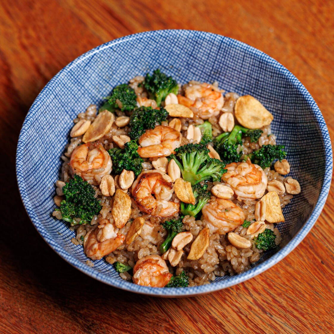 Cumbuca de arroz salteado com camarão e brócolis, amendoim, shoyu, alho laminado frito e limão.