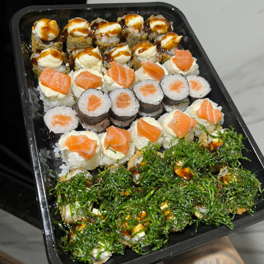 10 hot salmão Filadélfia 10 uramaki salmão grelhado 10 uramaki couve crispy 10 uramaki batata doce crispy