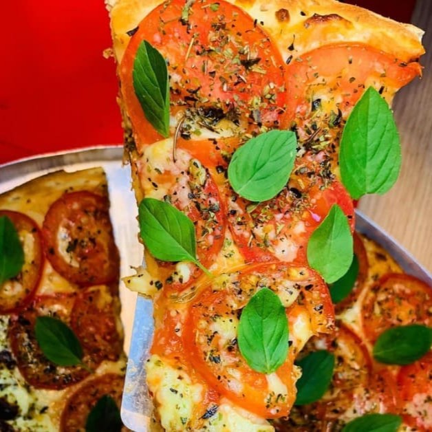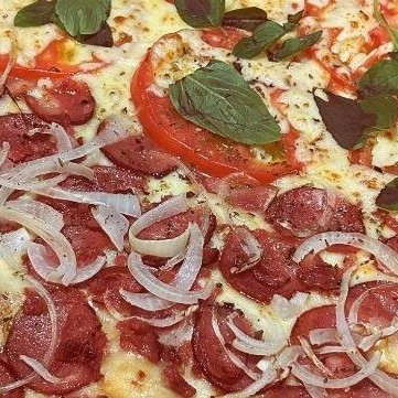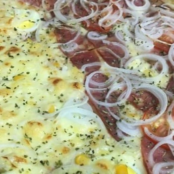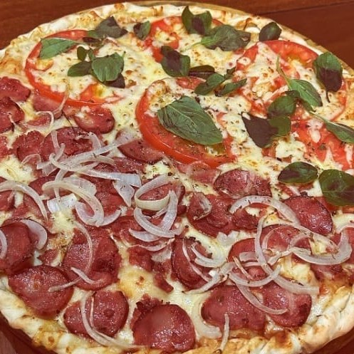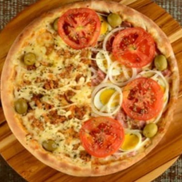 1/2 Calabresa: Molho de tomate, Calabresa e Cebola 1/2 Marguerita: Molho de tomate, Mussarela coberta com Molho, Mangericão e Parmesão.