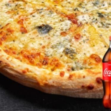 Pizza Broto 4 pedaços: Molho de tomate, Muçarela, Provolone, Parmesão, Requeijão cremoso e azeitonas fatiadas. Acompanha Coca-Cola 1l