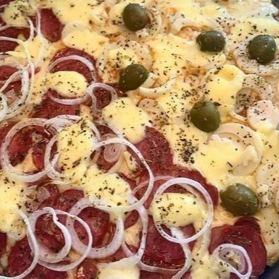 Calabresa- Molho de tomate, Muçarela, Calabresa fatiada, azeitonas fatiadas e orégano Mussarela- Molho de tomate, Muçarela, Calabresa fatiada, azeitonas fatiadas e orégano
