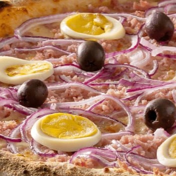 Calabresa- Molho de tomate, Muçarela, Calabresa fatiada, azeitonas fatiadas e orégano Portuguesa- Molho de tomate, muçarela, presunto fatiado, cebola fatiada, ovos fatiados, azeitonas fatiadas e orégano.