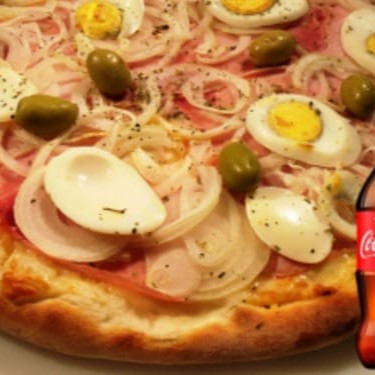 Pizza Broto 4 pedaços: Molho de tomate, muçarela, presunto fatiado, cebola fatiada, ovos fatiados, azeitonas fatiadas e orégano. Acompanha Coca cola 1l