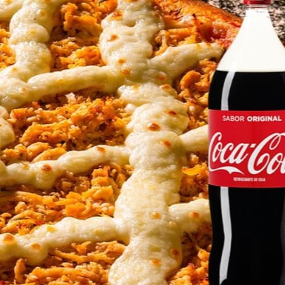 Pizza Broto 4 Pedaços: Molho de tomate, muçarela, Frango desfiado ao molho, requeijão cremoso e orégano. Acompanha Coca cola 1l