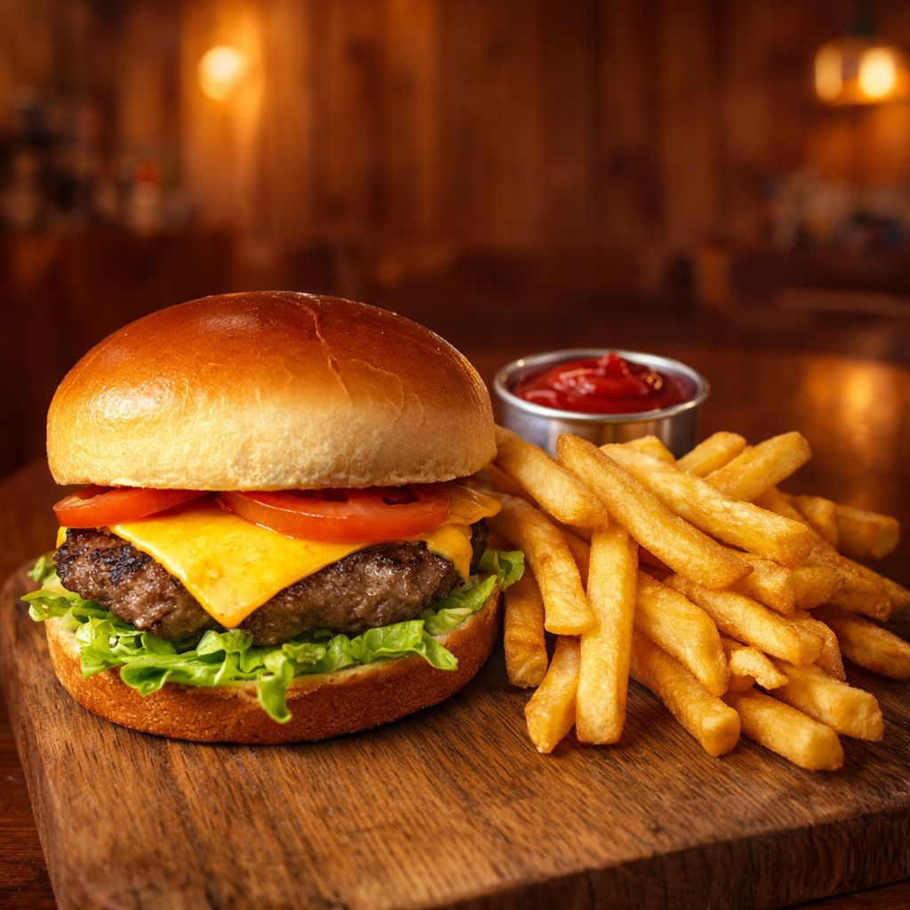 Hamburguer artesanal de 180g, alface, tomate, Queijo cheddar fatiado, maionese da casa e Pão brioche amanteigado. Acompanha 100g de batata palito
