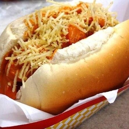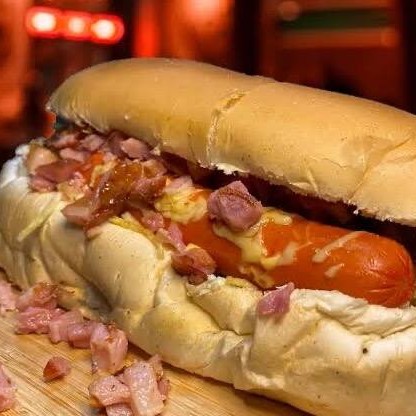 Pão, maionese, barbecue, tomate, cebola, milho, vina, batata palha, cheddar e calabresa.