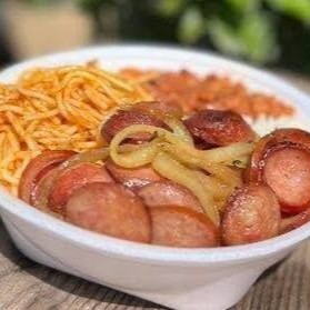 Acompanha Arroz, feijão, macarrão, batata frita farofa e calabresa acebolada.