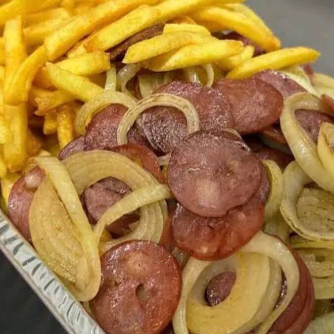 Porção generosa de batata frita com calabresa acebolada.