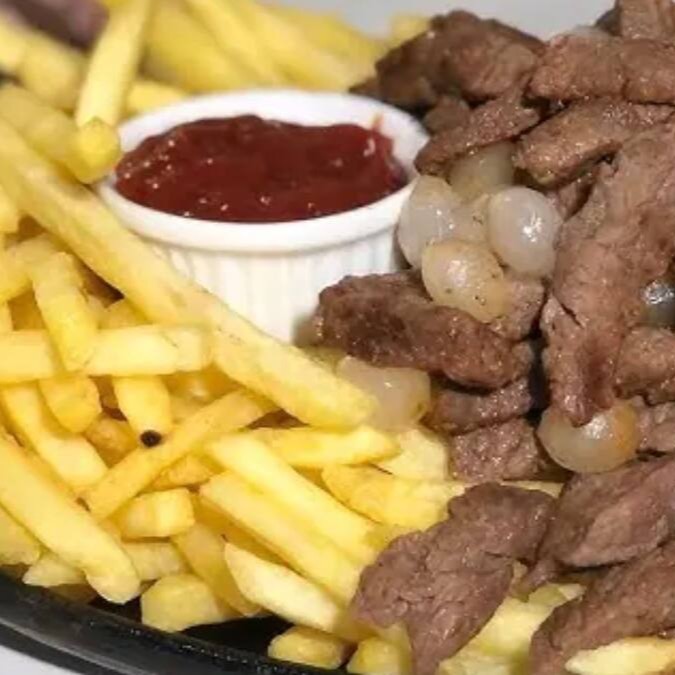 Porção generosa de btata frita com Alcatra acebolada na chapa.