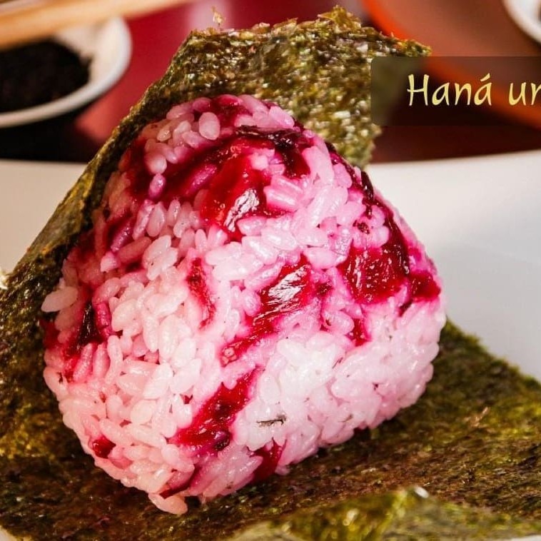 Uma unidade de onigiri de haná umê. Esse onigiri é um bolinho feito com a deliciosa mistura de arroz e haná umê (flor de hibisco em conserva)! O haná umê tem um sabor salgado e azedo! É diferente, simples e delicioso! Acompanha 1 sachê de shoyu! Prático, nutritivo, saboroso e faz crock! Uma unidade de aproximadmente 125g. Obs.: Não é possível retirar ou acrescentar ingredientes!