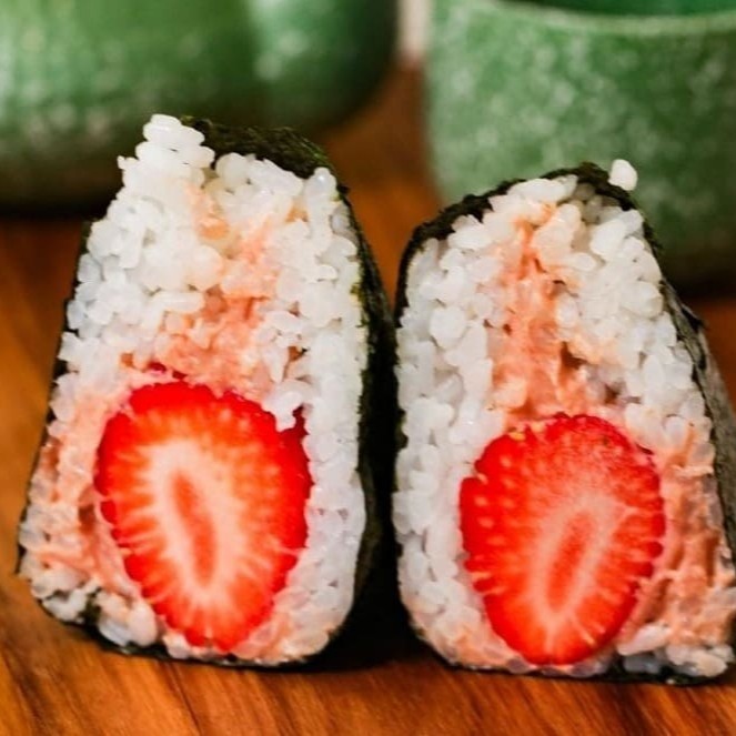 Uma unidade de onigiri de Romeu e Julieta. Onigiri deliciosamente recheado com goiabada cascão cremosa, cream cheese e morango. Prático, nutritivo, saboroso e faz crock! Uma unidade de aproximadmente 135g. Obs.: Não é possível retirar ou acrescentar ingredientes!