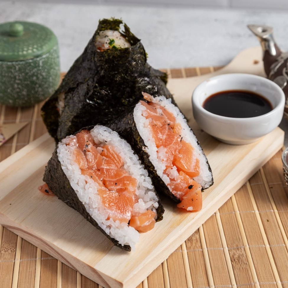 Esse trio é para quem ama onigiri de salmão de todas as formas! 1 onigiri salmão Filadélfia + 1 onigiri salmão Supremo + 1 onigiri de salmão grelhado!