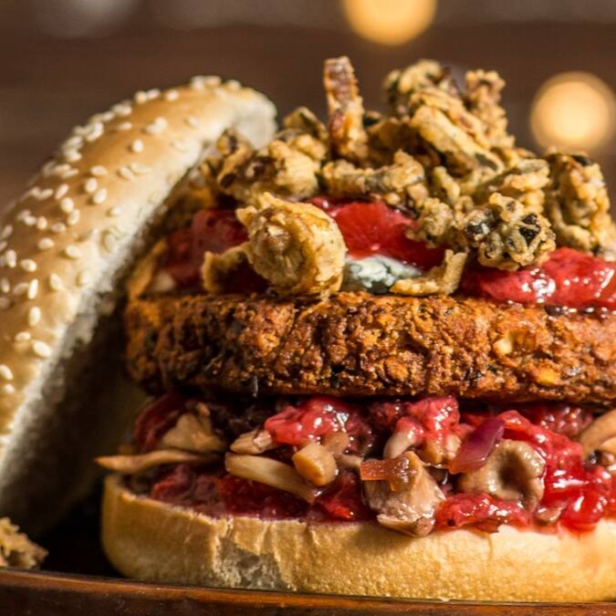 Pão de Gergelim, burger de falafel, cogumelos salteados, queijo gorgonzola, crispy de alho poró e nossa deliciosa geleia de morango com pimenta. ( na falta do pão de gergelim, será substituído por pão de brioche )