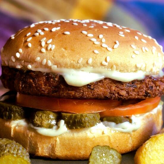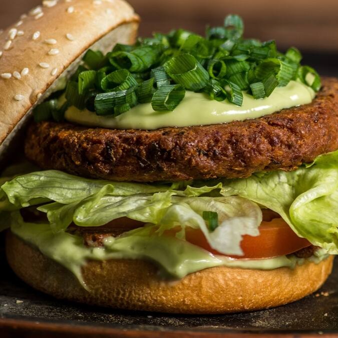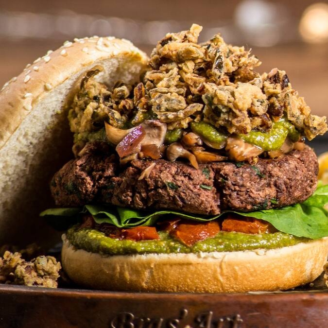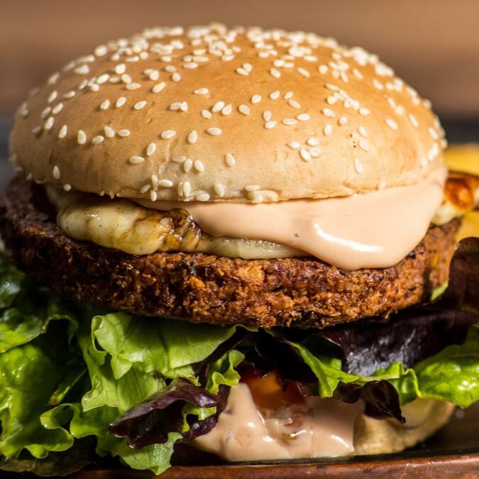 Pão de gergelim, burger de soja, rúcula, tomate seco, cogumelos salteados, crispy de alho poró e pesto de manjericão. ( na falta do pão de gergelim, será substituído por pão de brioche )