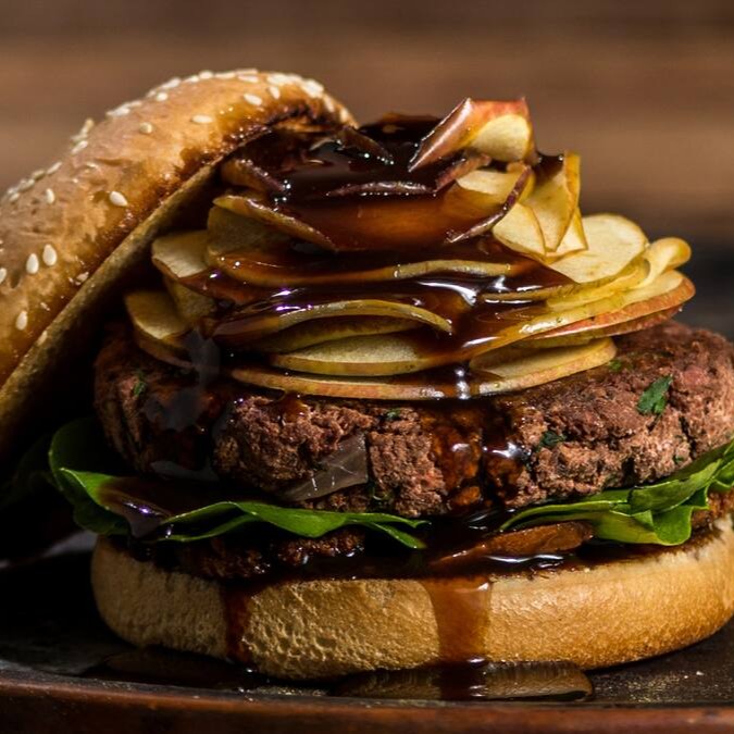 Pão de gergelim, burguer de soja, rúcula, maçã grelhada, caramelo e bacon vegetal. ( na falta do pão de gergelim, será substituído por pão de brioche )