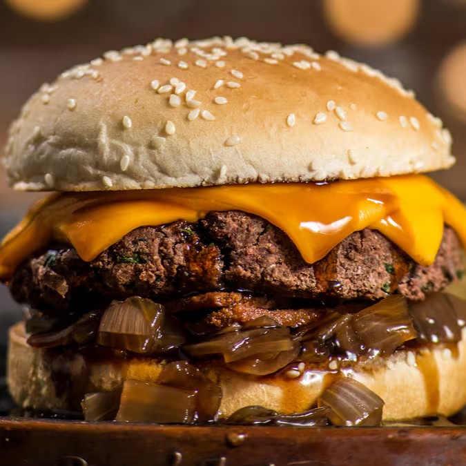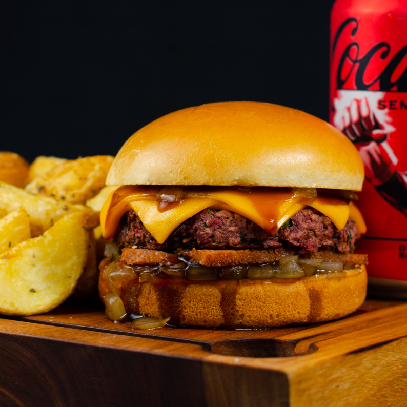 Pão de brioche, maionese temperada, bacon vegetal, burguer de soja, cebola caramelizada e muuito cheddar! ( na falta do pão de brioche, será substituído por pão de gergelim )