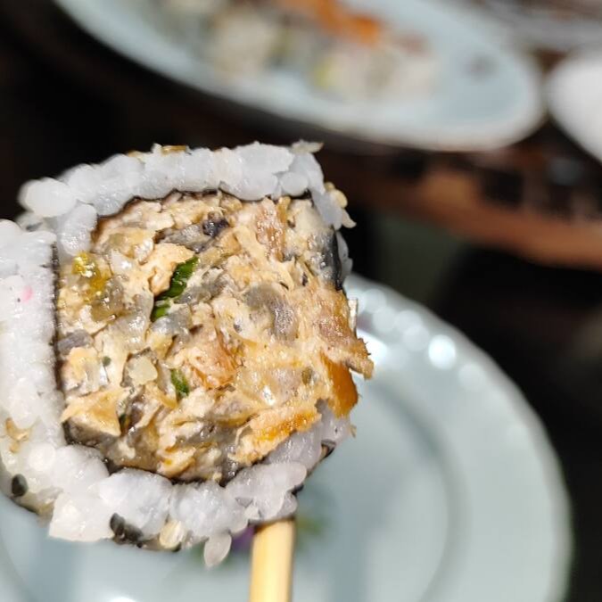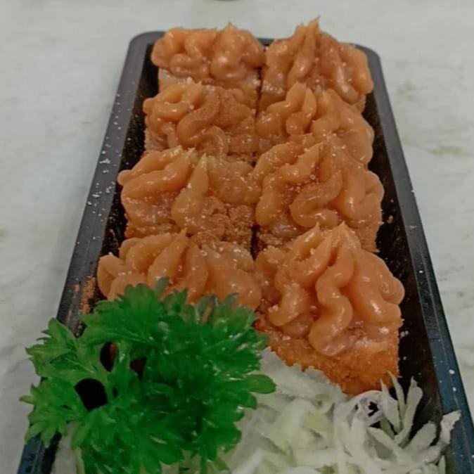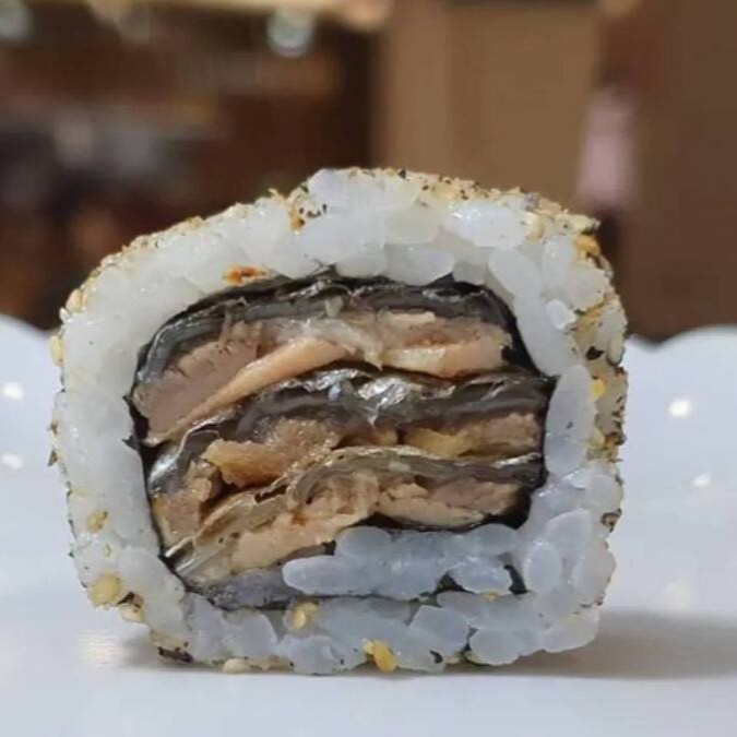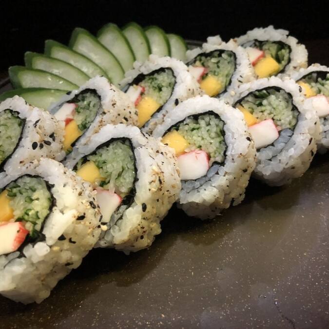 O kanikama (imitação de carne de caranguejo) é o principal recheio, trazendo uma textura suave e um sabor delicado, levemente adocicado. Para adicionar frescor, o pepino fatiado entra como um ingrediente crocante e refrescante, enquanto a manga oferece um toque de doçura natural e um sabor tropical. A finalização com gergelim torrado por cima dá um toque crocante e um sabor de nozes, completando a combinação de sabores e texturas.