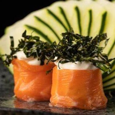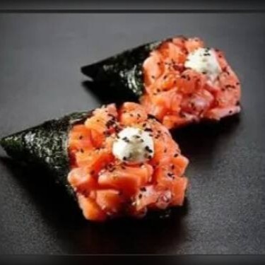 alga fina com base shari, recheado com pele de salmão grelhada e crocante ! Perfeitamente bem servido com molho tarê
