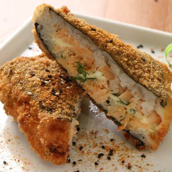 salmão com cream cheese e cebolinha enrolados na alga com shari empanado e frito servido com molho tarê !