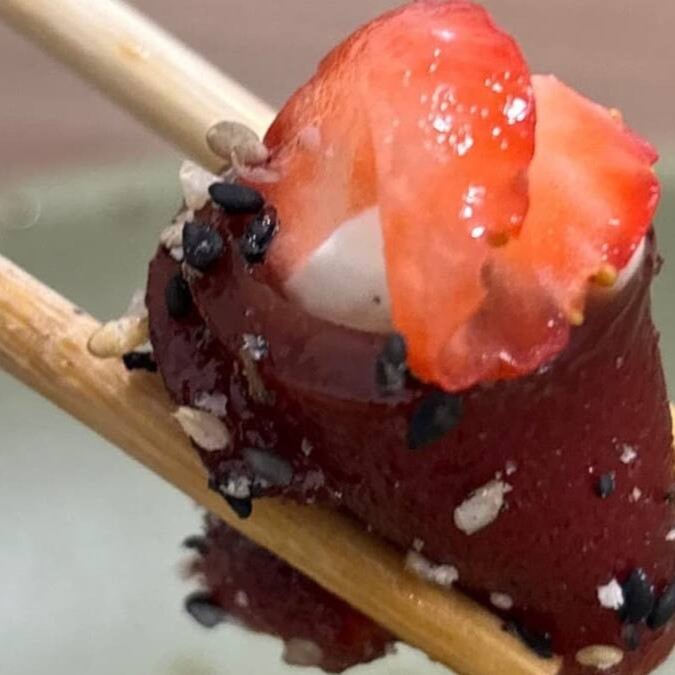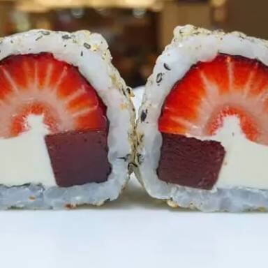 8 unidades. Sushi Romeu e Julieta é uma deliciosa fusão de sabores contrastantes e harmoniosos. Esse sushi é composto por um uramaki (sushi de arroz invertido, com a alga nori por dentro e o arroz por fora), recheado com uma camada de cream cheese cremoso, que proporciona uma textura suave e levemente ácida. O verdadeiro toque especial vem com o recheio de goiabada e morango, que adiciona um sabor doce e frutado, complementando o cream cheese de maneira única.