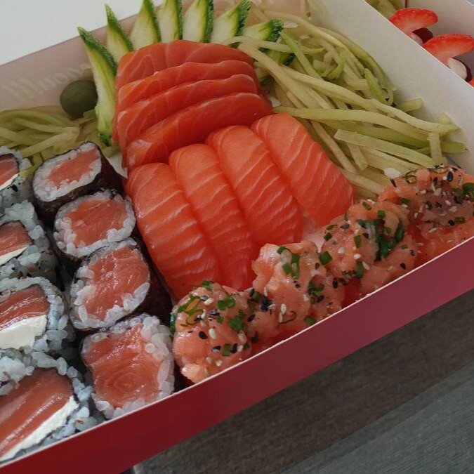 Este combinado de sushi é uma verdadeira explosão de sabores delicados e contrastantes. O salmão fresco é a estrela principal, com suas fatias macias e suculentas, que derretem na boca, trazendo o sabor do mar em cada mordida. O destaque do combinado é o uramaki doce "Romeu e Julieta", uma deliciosa fusão entre o sabor delicado do cream cheese e o toque adocicado da goiabada com o adicional do morango, que se mistura ao arroz de sushi e é envolto por alga crocante. Cada pedaço do uramaki é uma perfeita harmonia de sabores doces e salgados. Acompanhado de molho shoyu, gengibre em conserva, este combinado é uma verdadeira viagem de sabores e texturas que vai agradar até os paladares mais exigentes