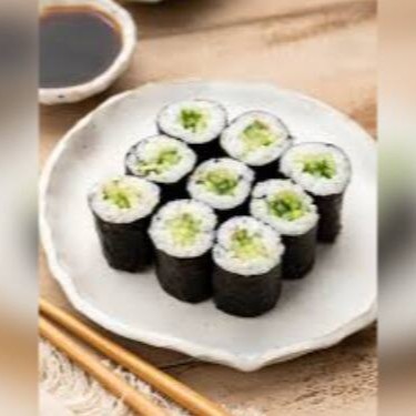 8 unidades de kappa maki, alga fina com base de arroz e com pepino fatiado.