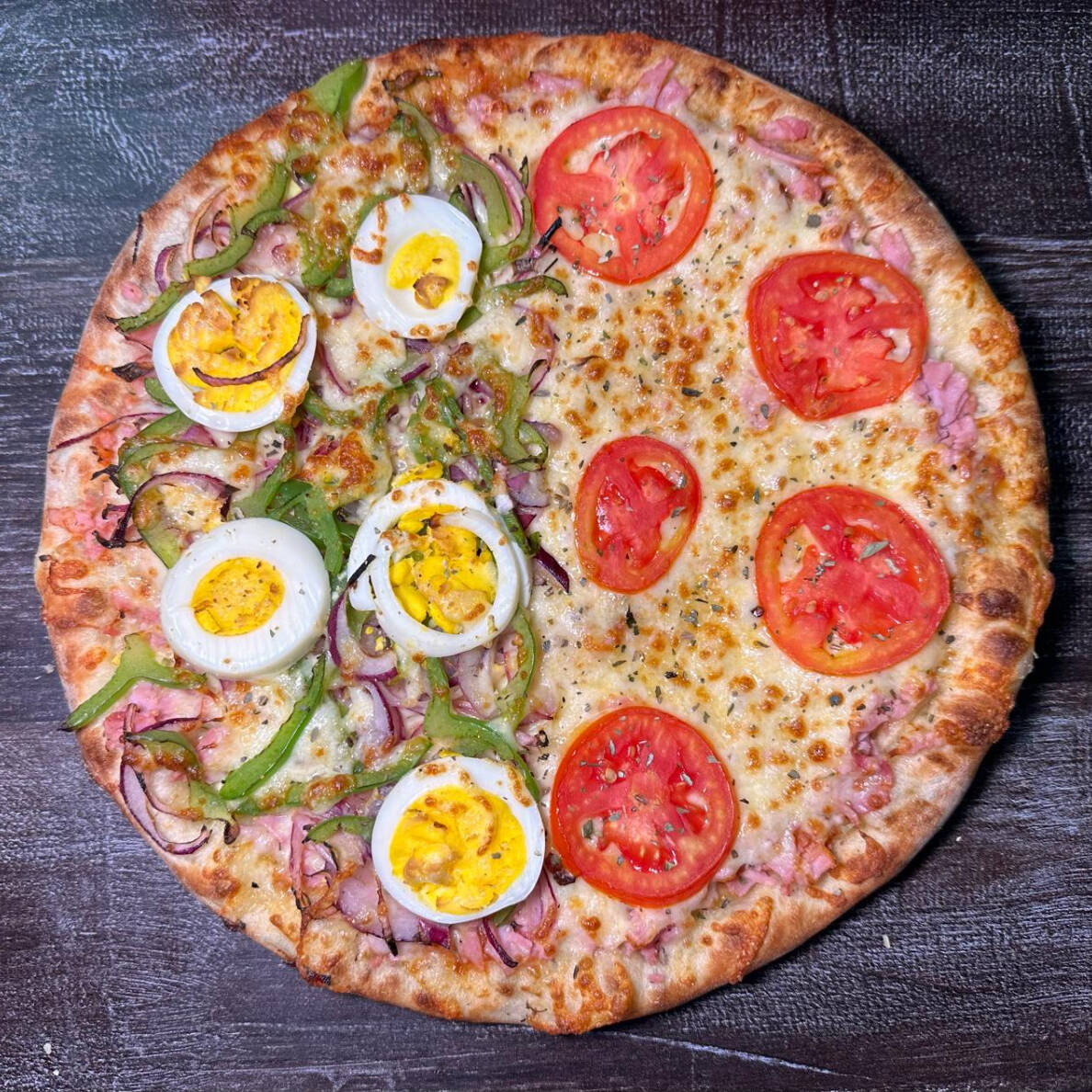 Muçarela, frango, bacon, requeijão cremoso, milho, tomate fatiado e palmito