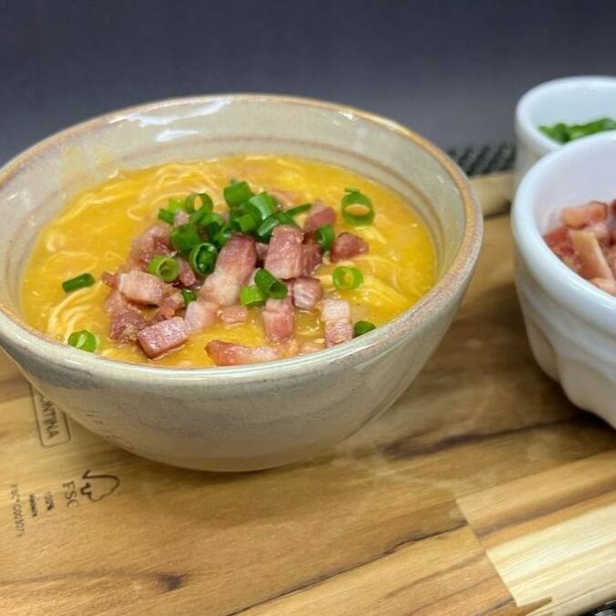 Delicioso Caldo de Aipim, preparado com peito de frango desfiado e calabresa, tamanho 350ml