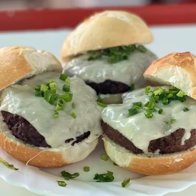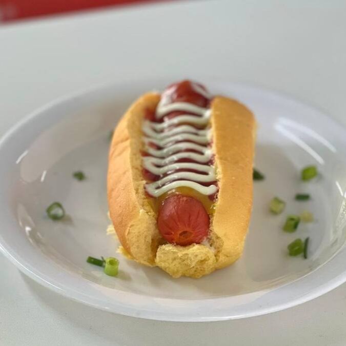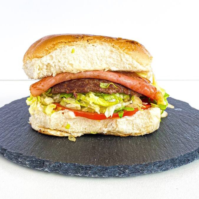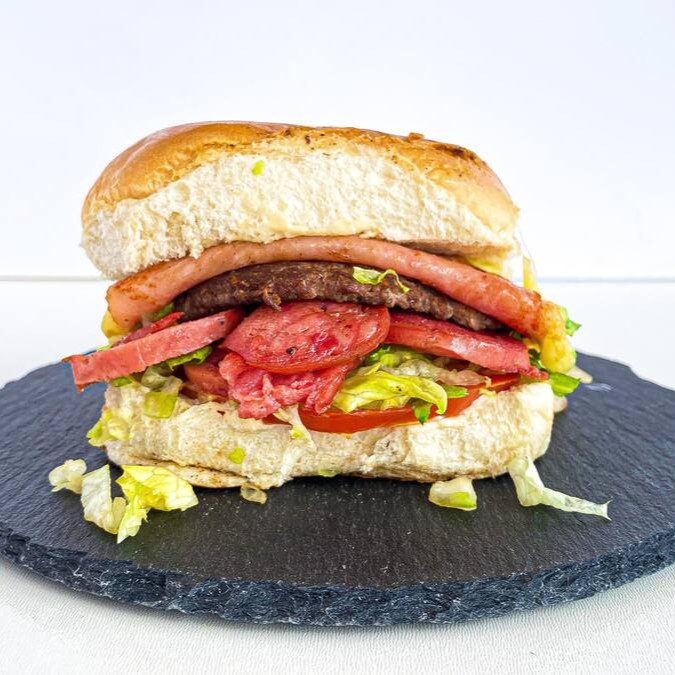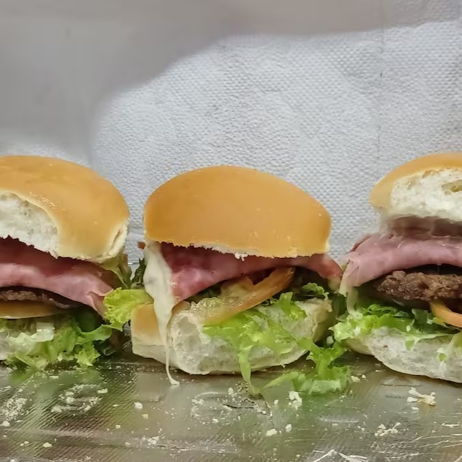 Pão, maionese caseira, hambúrguer smash alface, tomate, queijo e presunto.