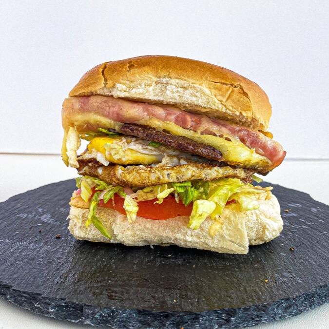 Pão, maionese caseira, 1 hambúrguer Smash, alface, tomate, queijo, presunto e 1 ovo.