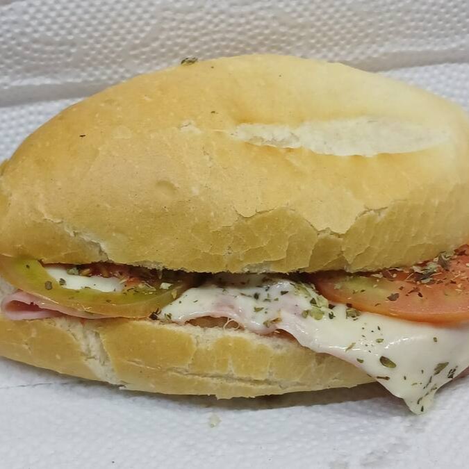 Pão francês, queijo, presunto, tomate e orégano.