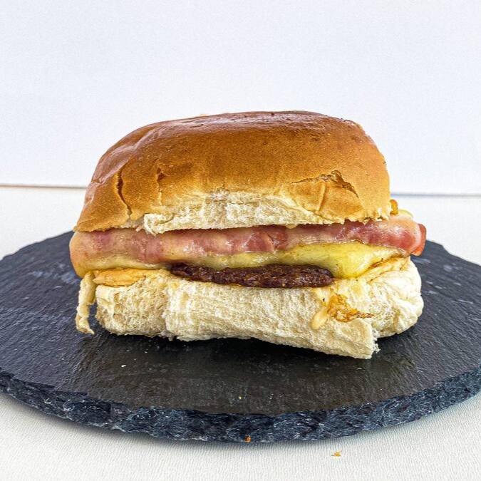 Pão, maionese caseira, 1 hambúrguer Smash, alface, tomate, queijo, presunto e bacon.