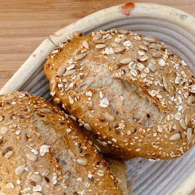 Farinha branca, farinha integral, sementes de girassol, soja tostada, chia, quinoa e amaranto.