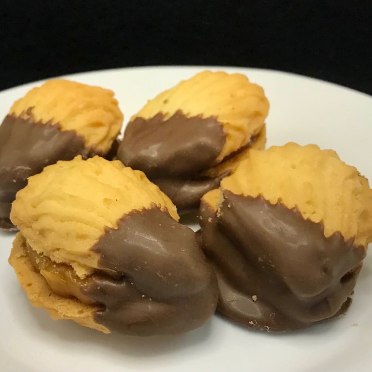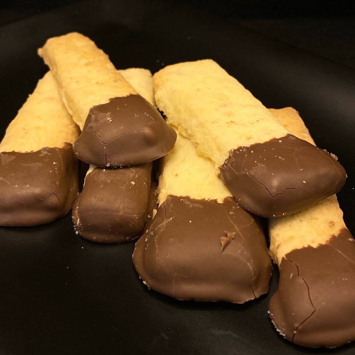 4 unidades de bolacha recheada com doce de leite com a ponta mergulhada no chocolate. Também conhecida como patinhas de gato.