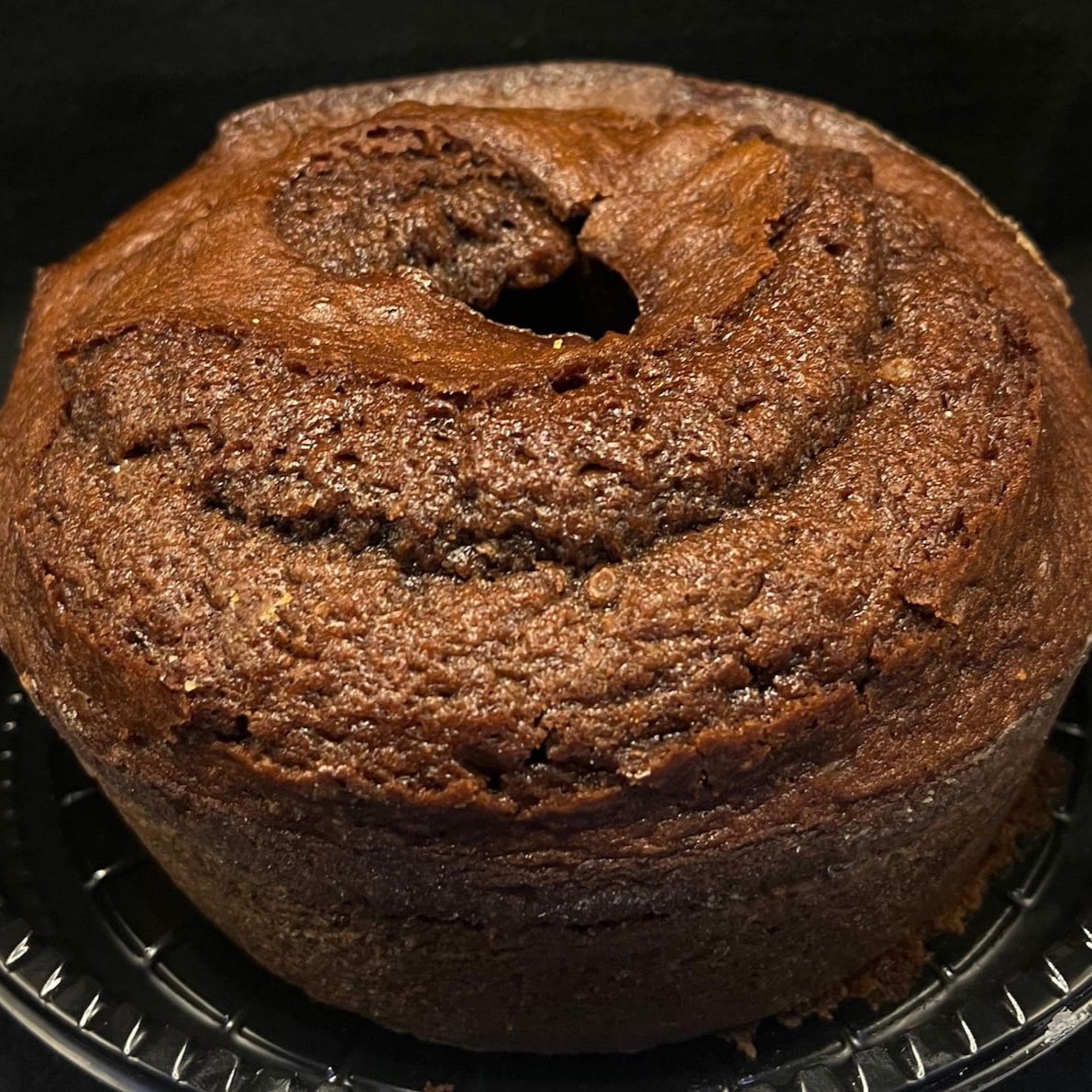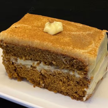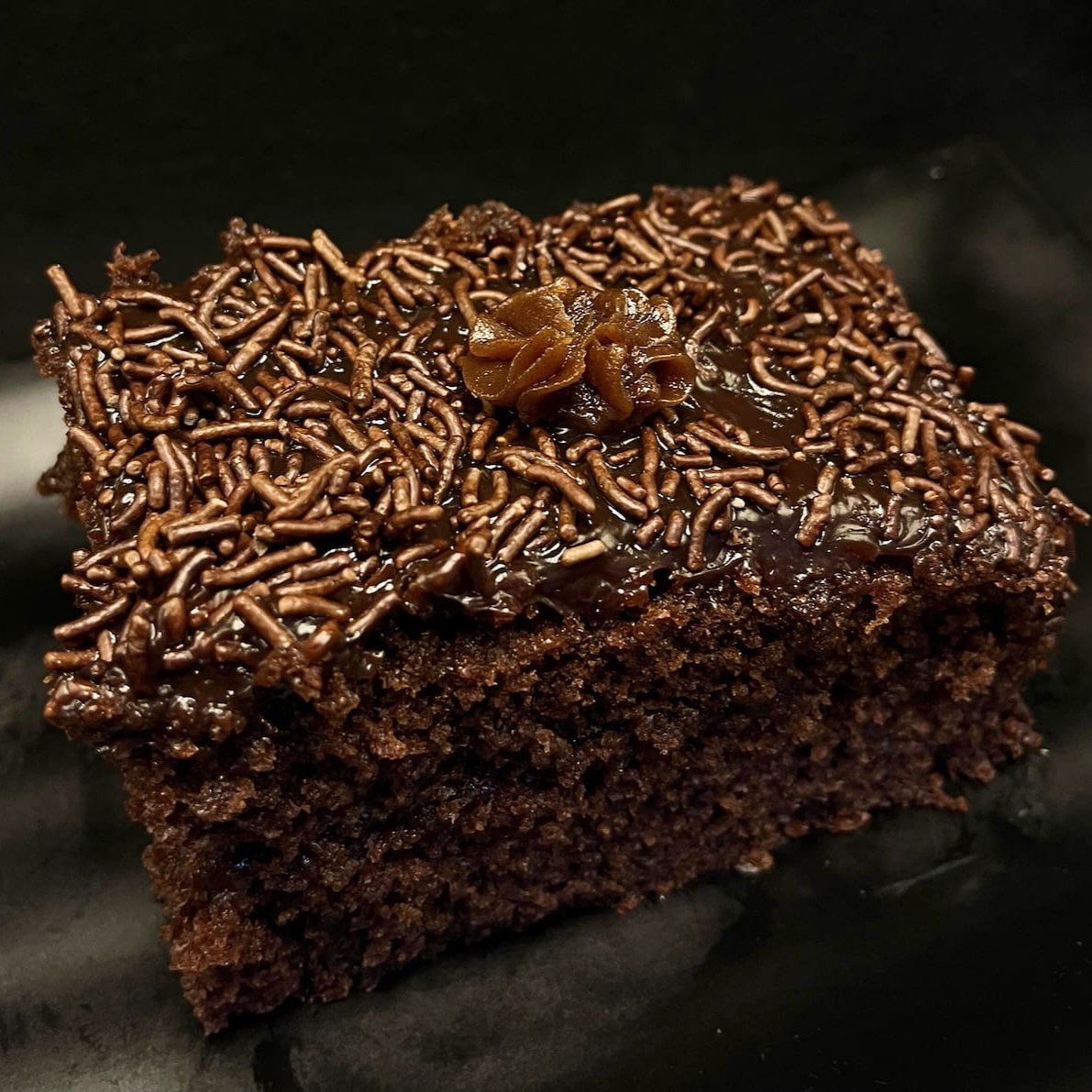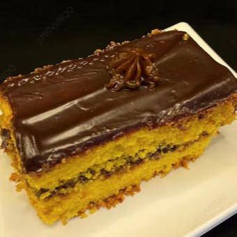 1 Fatia de bolo de cenoura com cobertura de chocolate.