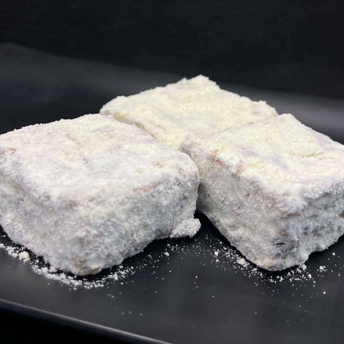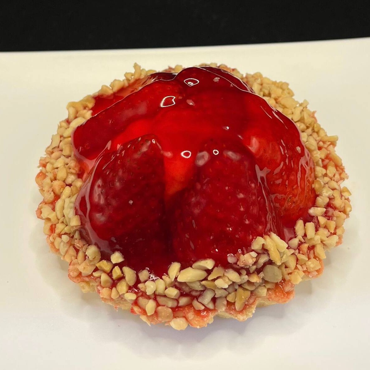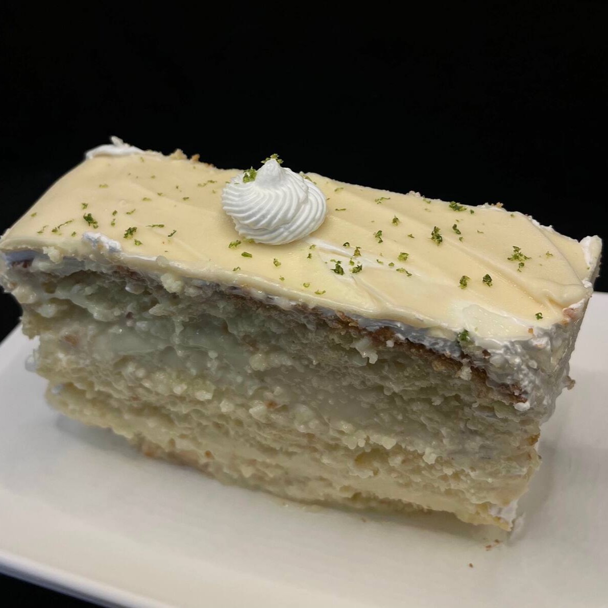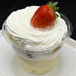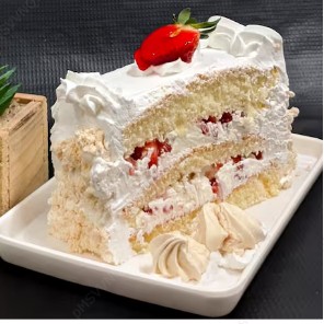 1 fatia de bolo de morango com suspiro. Recheado com duas camadas de morango com creme de leite Ninho.