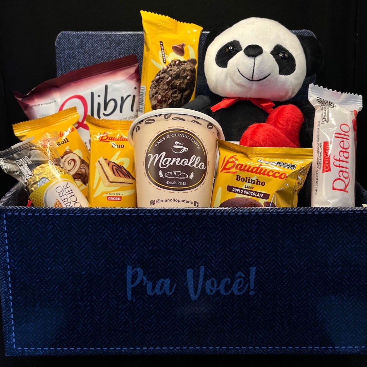 Na nossa cesta “Pra você” contém: • 1 Café • 1 Misto quente • 2 Pães de queijo • 1 Cueca virada • 1 Torradinha equilíbrio • 1 Cookie bauducco • 1 Bolinho bauducco duo • 1 Bolinho bauducco roll • 1 Bolinho bauducco duplo chocolate • 1 Rafaello • 1 Ferrero Rocher • 1 Pelúcia Urso(Branco creme ou Panda)