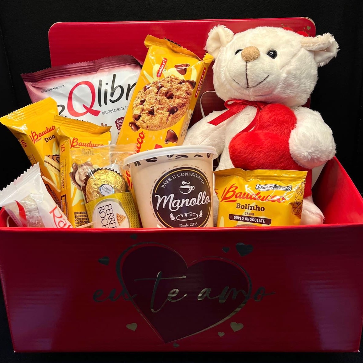 Na nossa cesta “Eu te amo” contém: • 1 Café • 1 Misto quente • 2 Pães de queijo • 1 Cueca virada • 1 Torradinha equilíbrio • 1 Cookie bauducco • 1 Bolinho bauducco duo • 1 Bolinho bauducco roll • 1 Bolinho bauducco duplo chocolate • 1 Rafaello • 1 Ferrero Rocher • 1 Pelúcia Urso(Branco creme ou Panda)