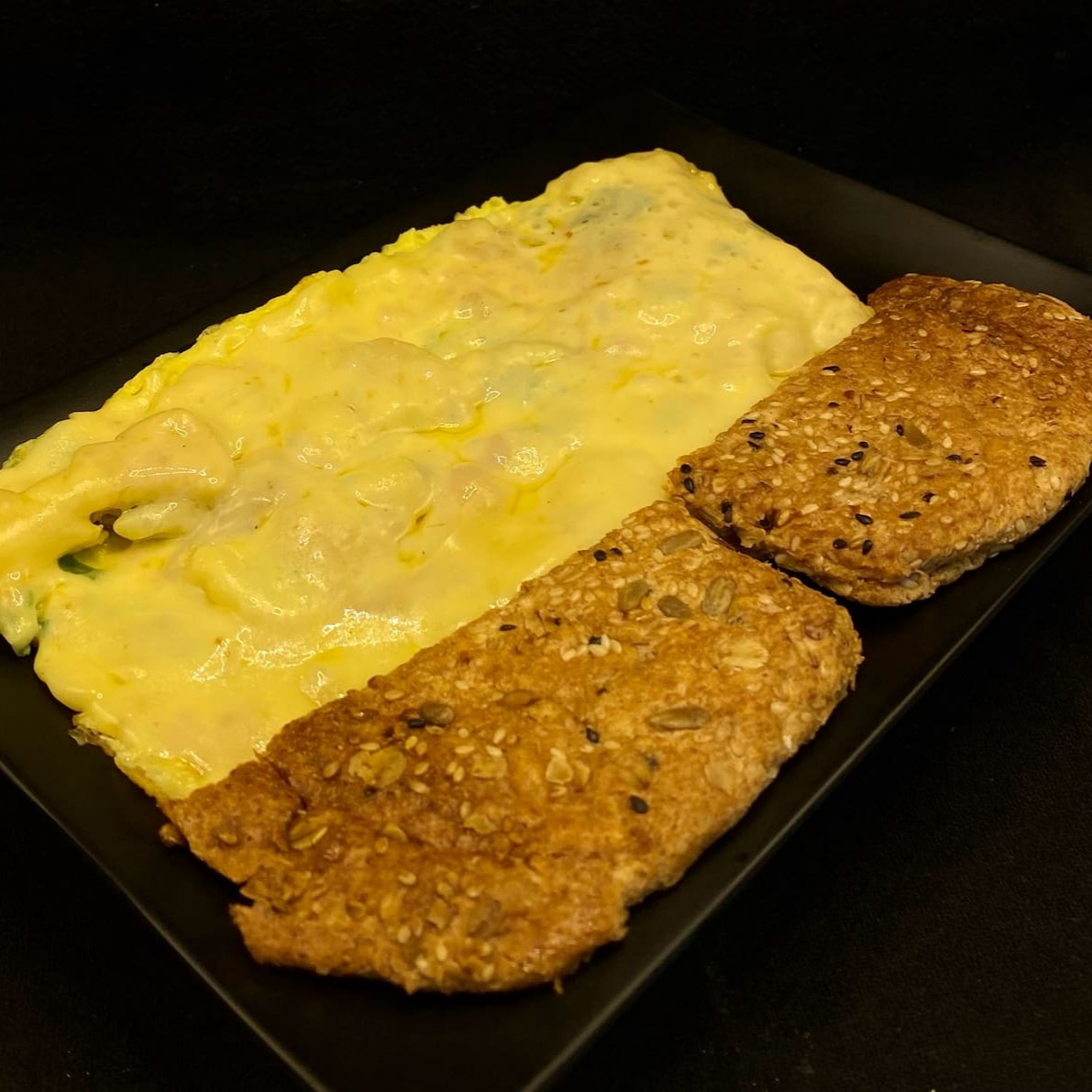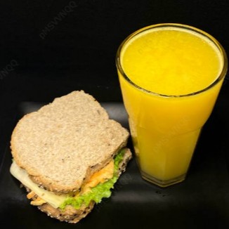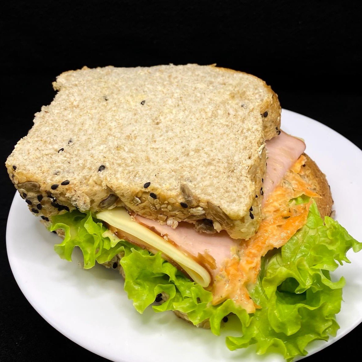 Pão integral com grãos (produção própria) feito com uma fatia de peito de peru, queijo + alface + cenoura ralada.