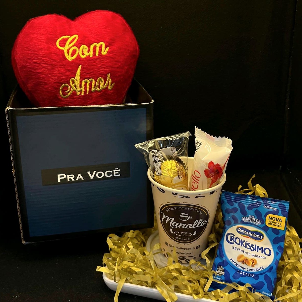 Na nossa caixa box “Pra você” contém: • 1 Café • 2 Pães de queijo • 1 Cueca virada • 1 Rafaello • 1 Ferrero Rocher • 1 Amendoim • 1 Coração pelúcia(Com amor ou Amo você)