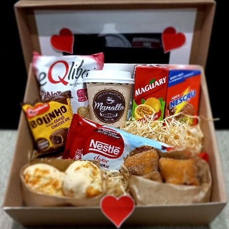 Na nossa caixa box “Coração” contém: • 1 Café • 2 Pães de queijo • 1 Cueca virada • 1 Rafaello • 1 Ferrero Rocher • 1 Big cookie bauducco • 1 Coração pelúcia(Com amor ou Amo você)