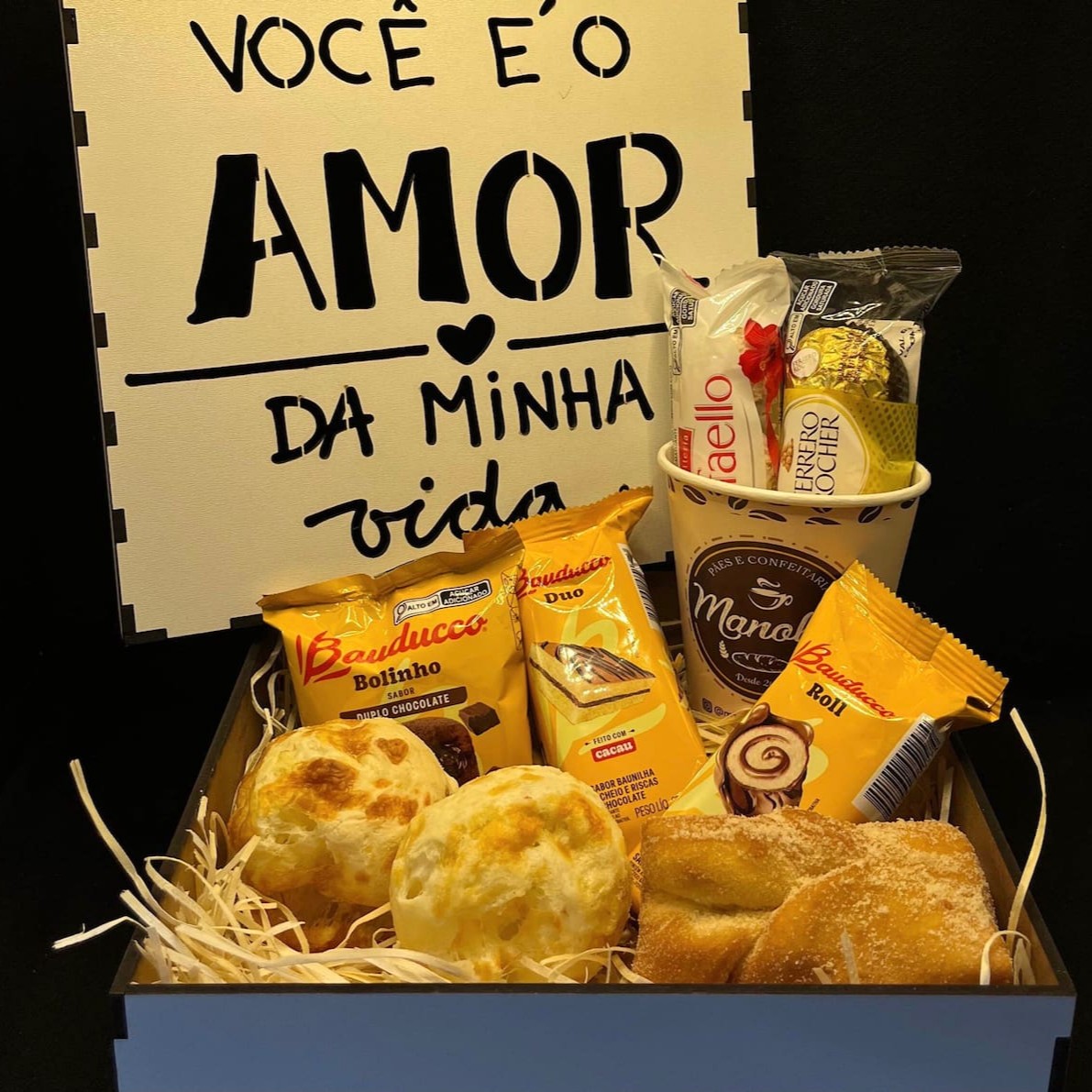 Na nossa caixa “Amor da minha vida” contém: • 1 Café • 2 Pães de queijo • 1 Cueca virada • 1 Rafaello • 1 Ferrero Rocher • 1 Bolinho bauducco duplo chocolate • 1 Bolinho bauducco duo • 1 Bolinho bauducco roll