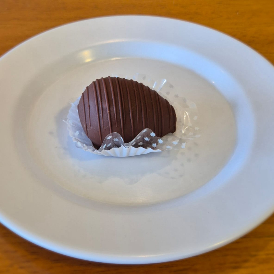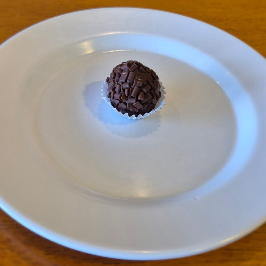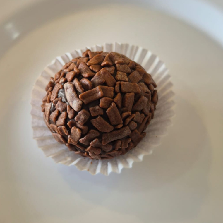 Brigadeiro tradicional feito com leite condensado, chocolate em pó e granulado de chocolate.