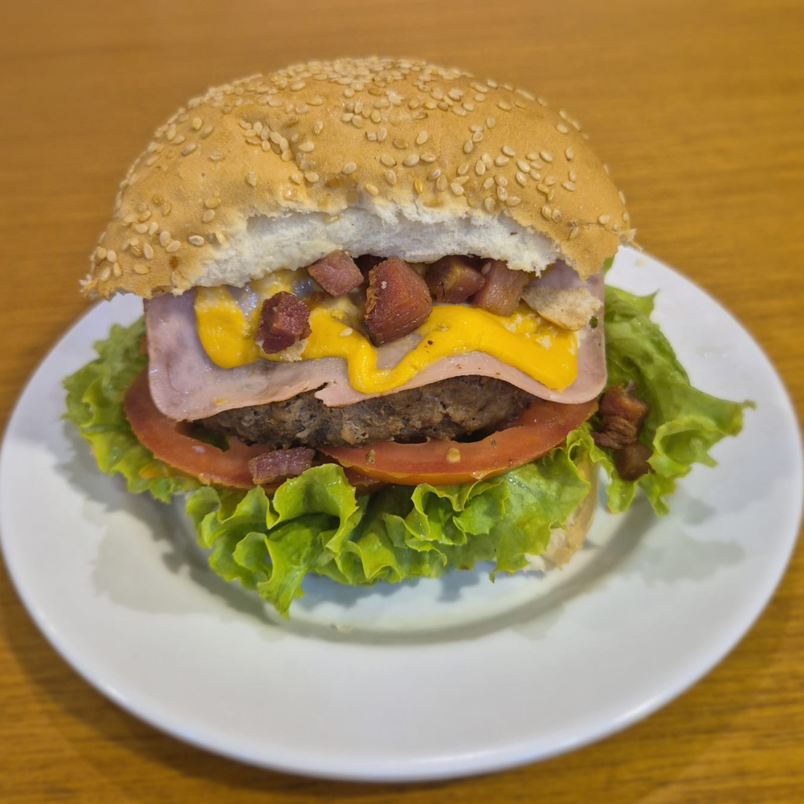 PÃO DE HAMBURGUER, HAMBURGUER 90 GR, BACON, PRESUNTO, QUEIJO, ALFACE E TOMATE