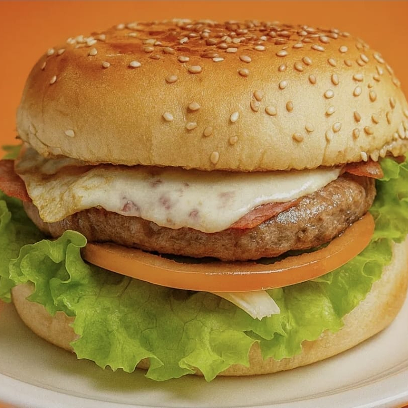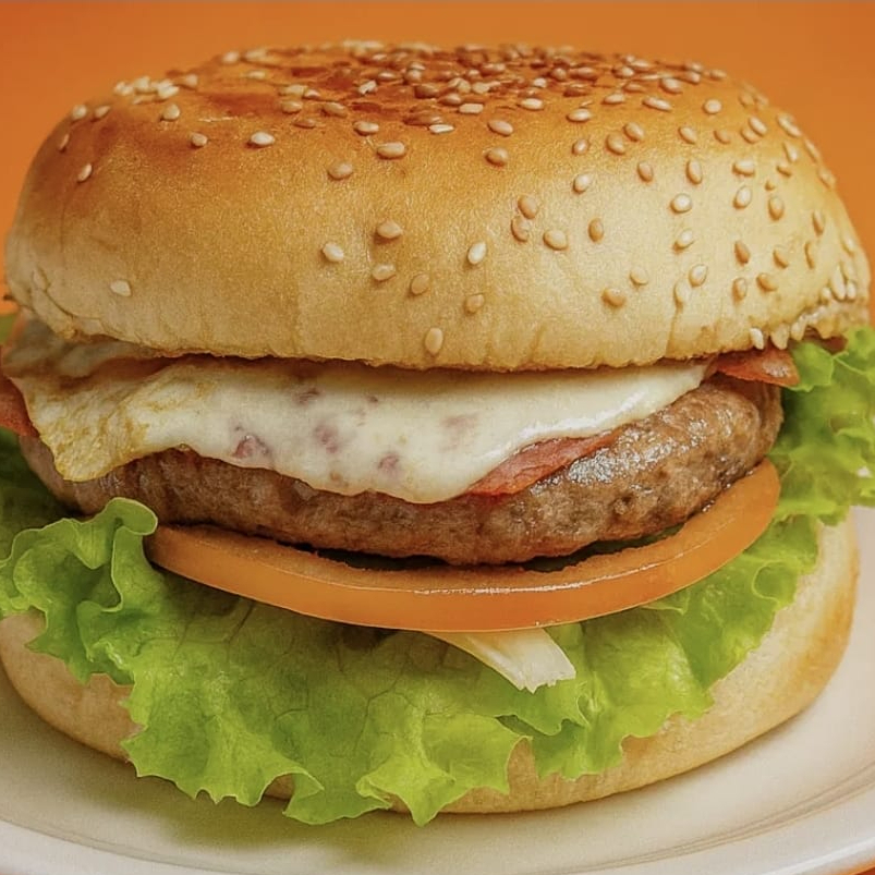 PÃO DE HAMBURGUER, HAMBURGER 90 GR, OVO, PRESUNTO, QUEIJO, ALFACE E TOMATE