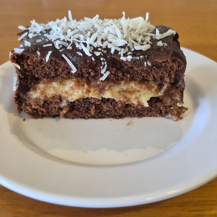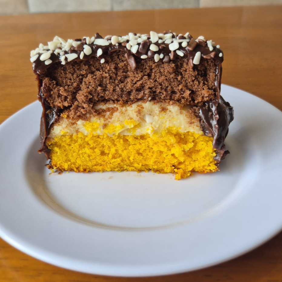 MASSA CHOC E MASSA CENOURA COM RECHEIO LEITE NINHO FATIA