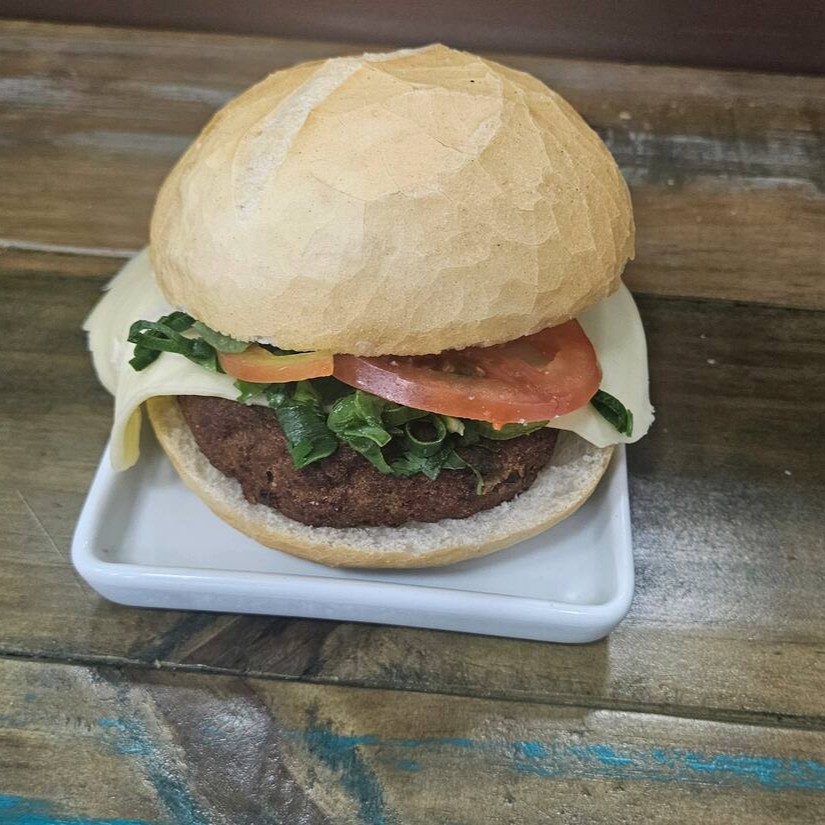 Um delicioso bolinho de carne, com queijo, cheiro verde e tomate.